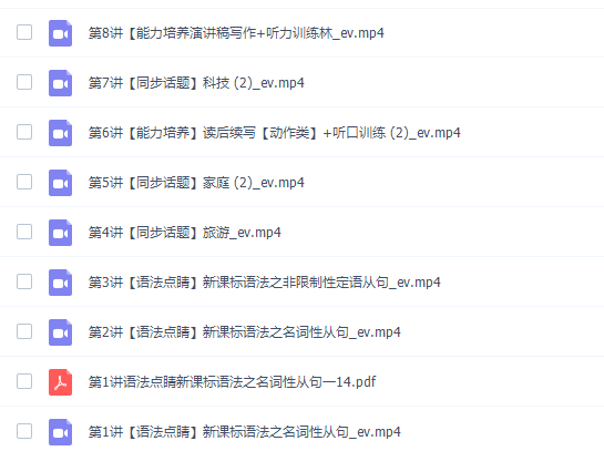 此课件来自课堂网校,王双林2022寒假高一英语寒假系统班8讲完结。此课件主要知识点包括:新课标语法之名词性从句、新课标语法之非限制性定语从句、旅游、家庭 、读后续写(动作类)、听口训练、科技 、能力培养演讲稿写作。