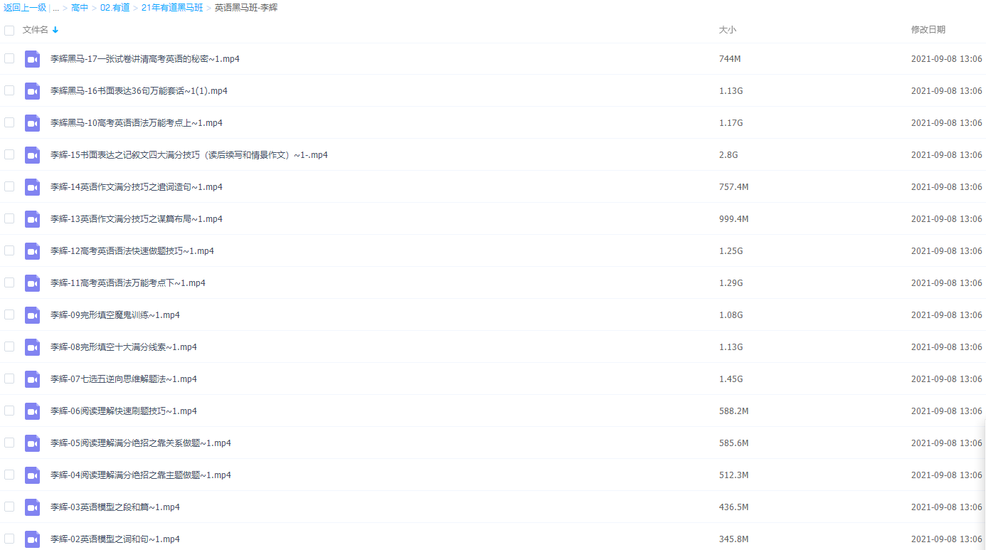 此课件来自有道精品课,2021有道精品课李辉英语高考黑马班视频课程。此课件知识点主要包括英语模型之词和句、英语模型之段和篇、阅读理解满分绝招之靠主题做题、阅读理解满分绝招之靠关系做题、阅读理解快速刷题技巧、七选五逆向思维解题法、完形填空十大满分线索、完形填空魔鬼训练、高考英语语法万能考点、高考英语语法快速做题技巧、英语作文满分技巧之谋筒布局、英语作文满分技巧之遣词造句、书面表达之记叙文四大满分技巧(读后续写和情景作文)、书面表达36句万能套话等视频