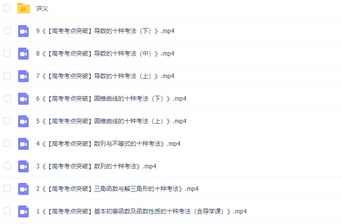 此课件来自高考数学二轮复习体系班(理科)目标清北课程,此课件主要知识点包括:基本初等函数及函数性质的十种考法、三角函数与解三角形的十种考法、数列的十种考法、数列与不等式的十种考法、圆锥曲线的十种考法、导数的十种考法。