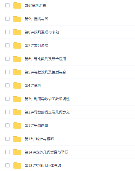 此课件来自猿辅导网校,王晶高三数学2021年秋季A+班课程完结。此课件主要知识点包括:开学典礼暨课程导学、平面向量、导数的概念及几何意义、利用导数求函数单调性、利用导数求函数极最值、等差数列及综合应用、等比数列及综合应用、数列通项、数列求和、直线与圆的方程、椭圆的定义及性质、双曲线、抛物线的定义及性质、空间几何体与球、立体几何平行与垂直、概率与统计等视频。