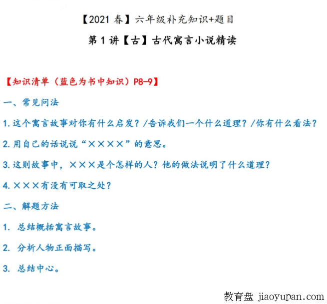 小学六年级语文课,达吾力江老师课程,古代寓言小说赏读,学习怎么样分析理解小说,可以提高语文阅读理解能力。内容:一、常见问法1.这个寓言故事对你有什么启发?/告诉我们一个什么道理?/你有什么看法?2.用自己的话说说“××××”的意思。3.这则故事中,×××是个怎样的人?他的做法说明了什么道理?4.×××有没有可取之处?二、解题方法1.总结概括寓言故事。2.分析人物正面描写。3.总结中心。语文学习方法技巧:1、多读书:多读是建立在精读的基础上的。读文章时一定要注意它的内涵。反复看课文上的文章,将精彩之处做上标记,写上自己的感受、思考。2、多练习写作,可以通过写日记的方法:不管是杂文、散文,还是小说,都可以写,写完了要反复修改,这样才能真正提高自己的写作能力。要多思考,学而不思则惘。3、多注意观察:会发现生活中有很多素材可以成为写作的素材。通过阅读首先是要感知作品内容,了解它写的是什么地方、什么人、什么事,故事的情节是怎样发生、发展、达到目的且结束的,矛盾又是怎样解决的等等。达吾力江,学而思网校小学高年级语文教师,课堂幽默风趣,讲解细致,让学生在轻松的环境中学习到语文知识,有对老师感兴趣的或者对课程感兴趣的同学可以下载看看!