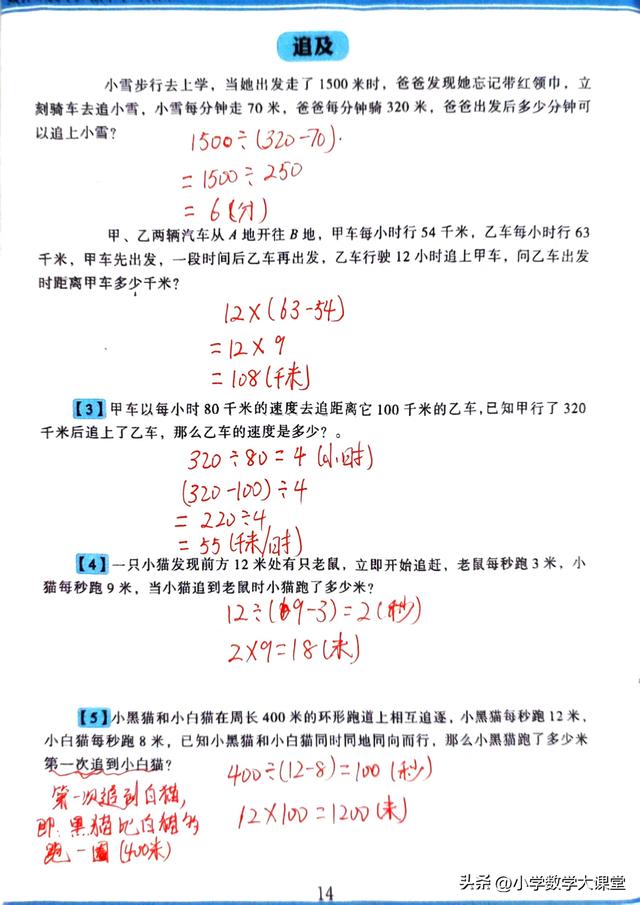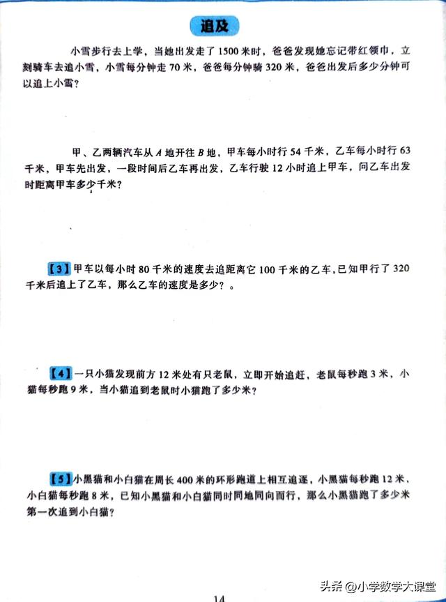 1、小雪步行去上学,当她出发走了1500米时,爸爸发现她忘记带红领巾,立刻骑车去追小雪,小雪每分钟走70米,爸爸每分钟骑320米,爸爸出发后多少分钟可以追上小雪?