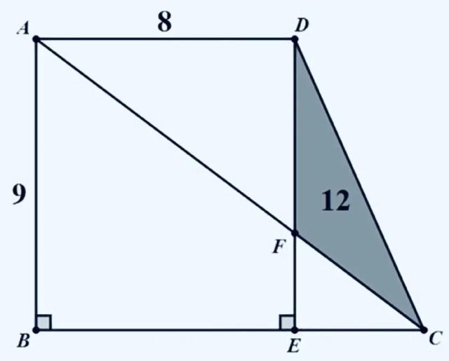 今天和大家分享一道比较基础的题目。题目如下,如图所示,在直角梯形ABCD中,∠B=90度,AD∥BC,AD=8,AB=9,过D点作DE⊥BC,交AC于点F,若三角形DFC面积为12,求直角梯形ABCD的面积是多少。
