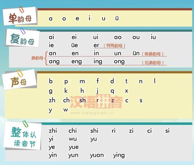 总结,单韵母6个,声母23个,复韵母9个,前鼻韵母5个,后鼻韵母4个,整体认读16个。