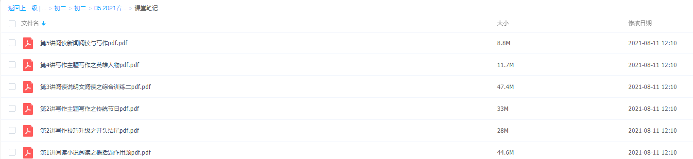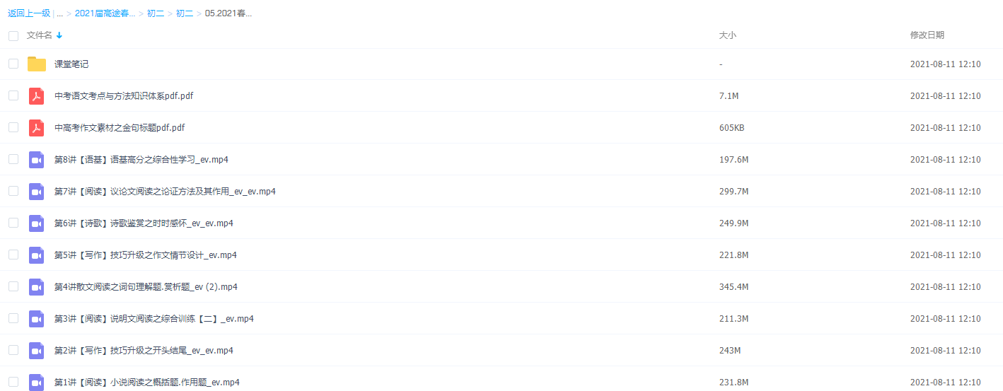 此课件来自课堂,2021年初二语文暑期班(王先意完结),包含视频课程和讲义资料 。 此课件主要内容包括:写作技巧升级之开头结尾、散文阅读之词句理解题.赏析题、阅读新闻阅读与写作、写作主题写作之传统节日等视频