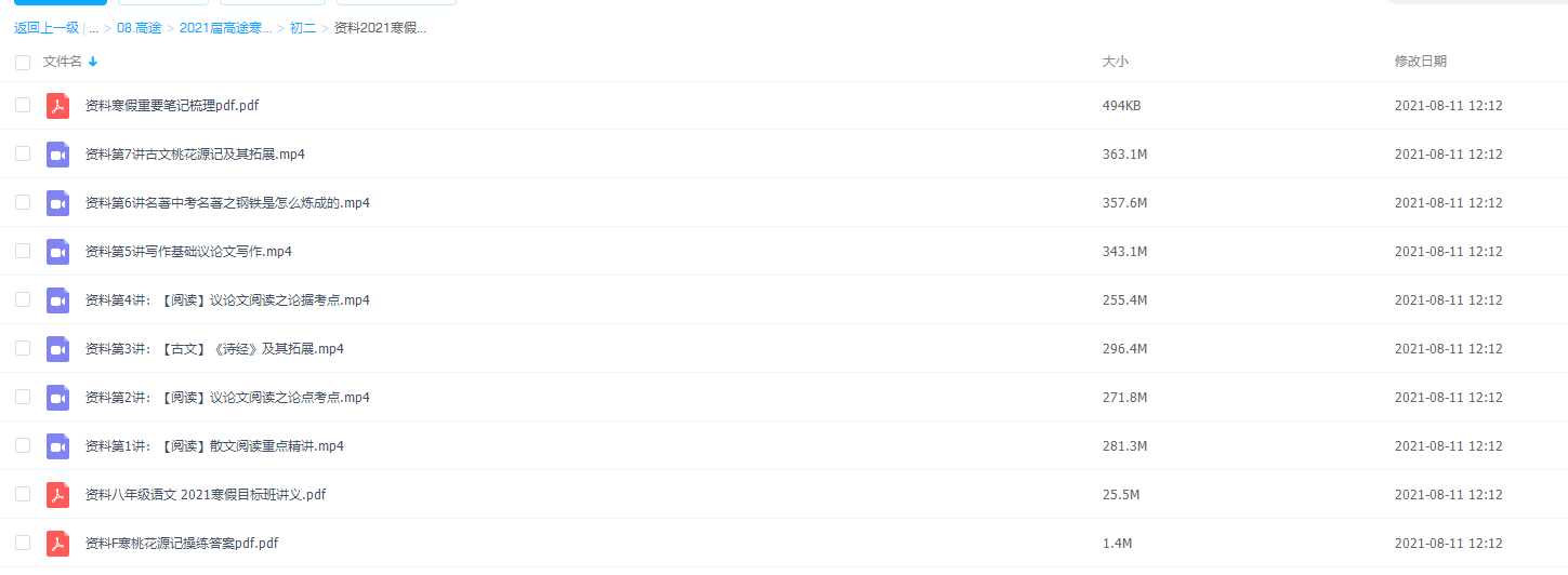 此课件来自课堂,2021初二王先意语文寒假班完结版,包含视频课程和讲义资料 。 此课件主要内容包括: 散文阅读重点精讲、议论文阅读之论点考点、《诗经》及其拓展、议论文阅读之论据考点、写作基础议论文写作、名著中考名著之钢铁是怎么炼成的、古文桃花源记及其拓展等视频