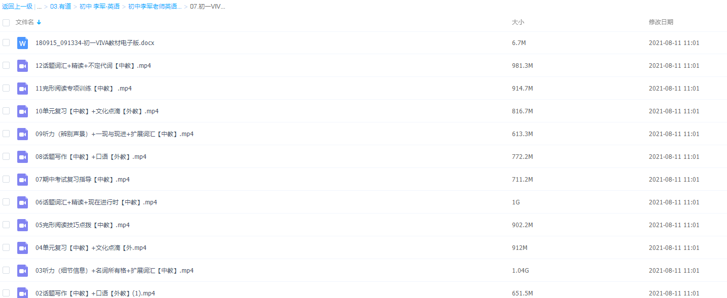 此课件来自有道精品课,有道李军初一VIVA英语秋季系统班。此课件的主要内容包括: 话题词汇+精读+一般现在时、听力(细节信息)+名词所有格+扩展词汇【中教】、话题词汇+精读+现在进行时【中教】、话题词汇+精读+现在进行时【中教】、听力(辨别声景)+一现与现进+扩展词汇【中教】等视频